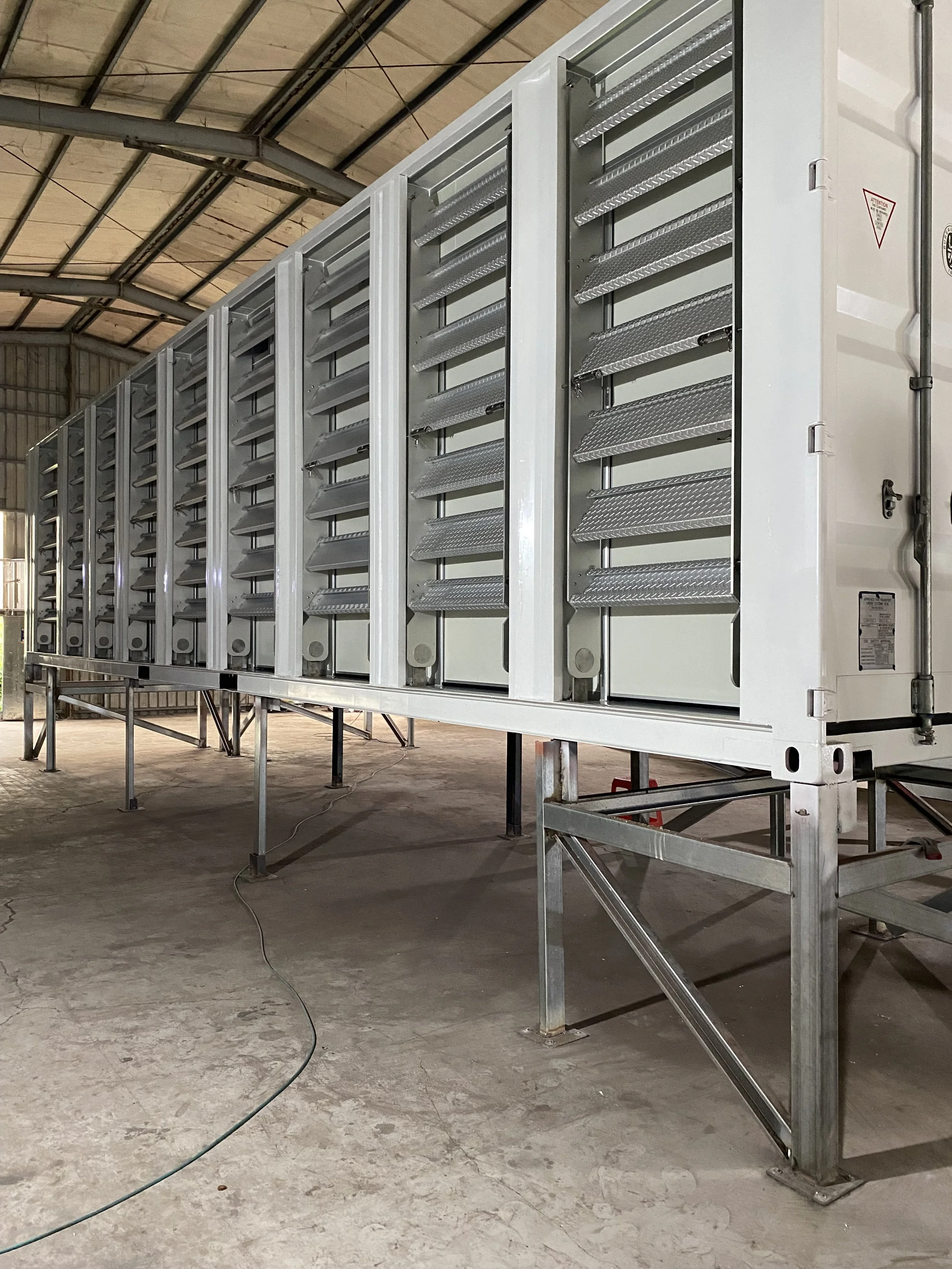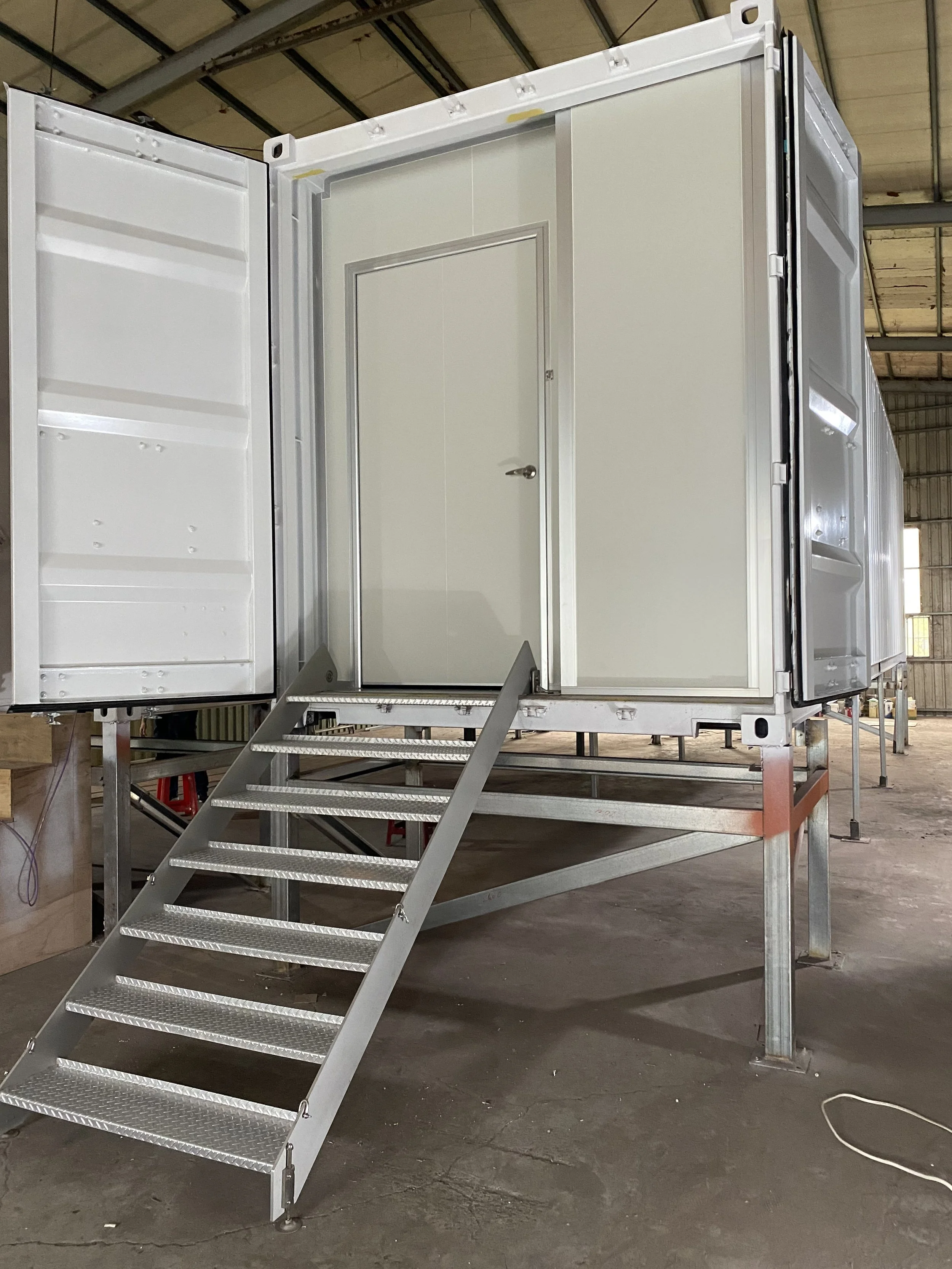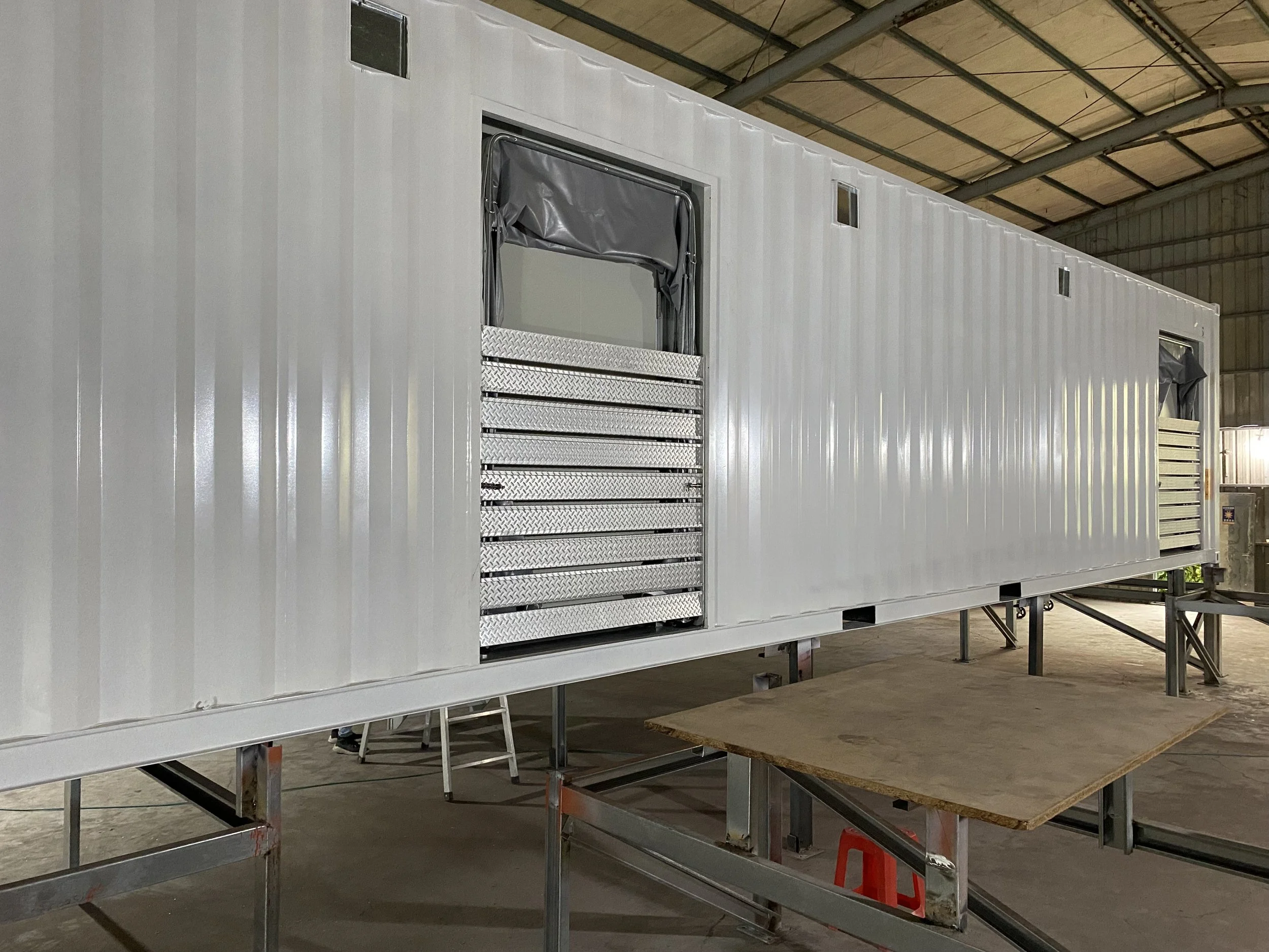因為未來在日本將由貨櫃車機動拖到各地,且將兩貨櫃平行放置連通使用,因此在建置過程,特別模擬未來情境,架高到貨櫃車高度,以確認樓梯收放的便利性及安全性,更模擬未來貨櫃在一定距離、一定進出面下連通道如何彈性運用,並在多雨、多雪環境下保障人員使用的安全。